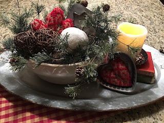 A little decorating did happen in the last few weeks - although not much. I love this big tray I bought down at Buttermilk Basins open house last fall. I had it decorated with this big bowl during the holidays and just switched out a few things for Valentines decorating. A little hard to see - but those hearts are made from an old coverlet and have an antique key in the center.